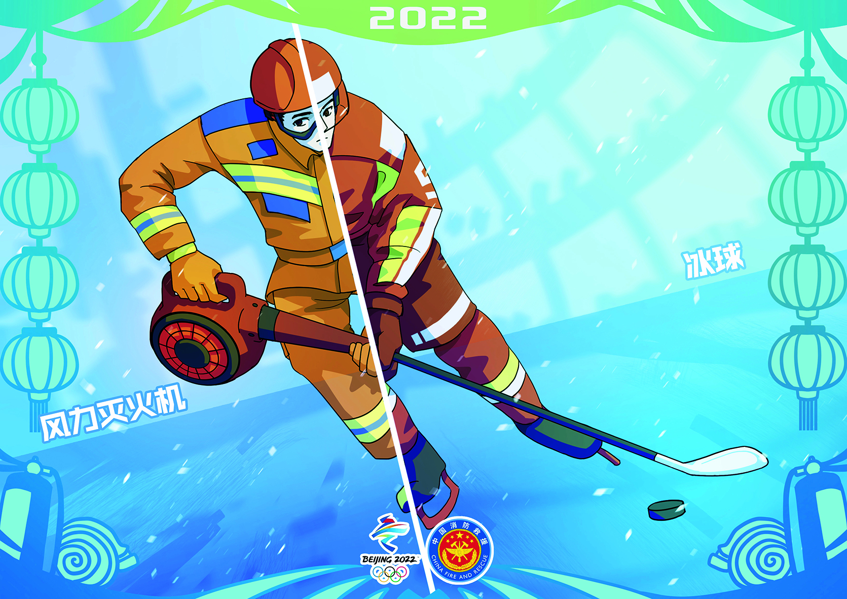 作品简介:作品依托2022年北京冬奥会体育赛事,将运动员形象与消防员形象相融合,赛场与火场融为一体,同时展现消防员赴汤蹈火的形象与运动员奋力拼搏的形象,将消防器材与冰上运动融合科普,创作出消防员的“奥运会”。